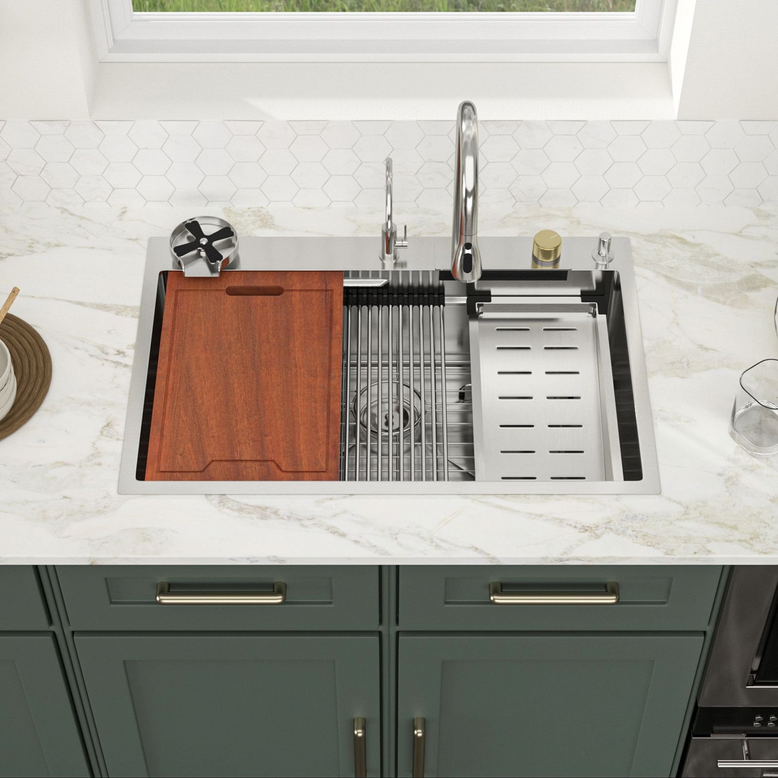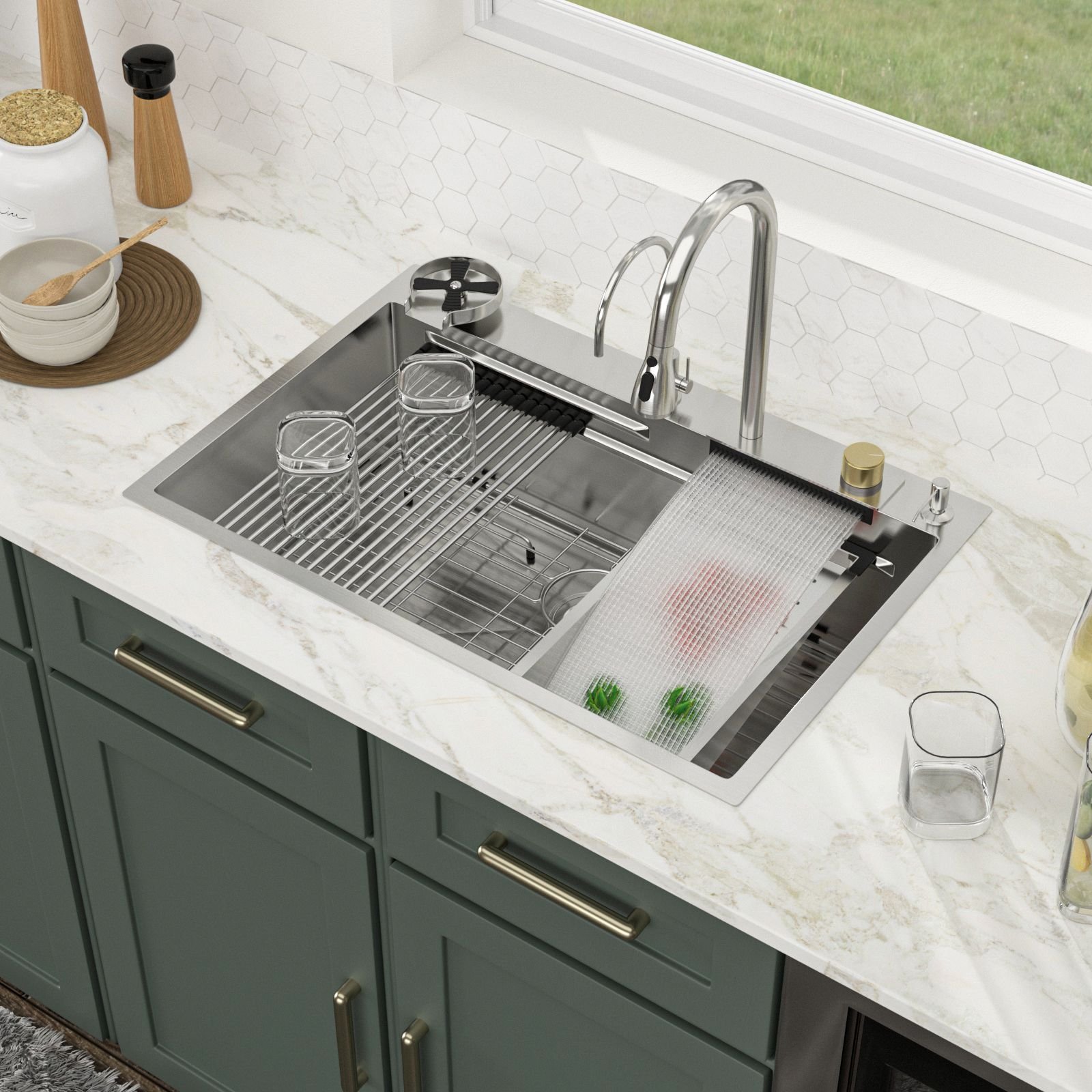 Package include: a top-mount stainless steel kitchen sink, cup washer, pull out faucet, rolling drying rack, colander, cutting board, drain, bottom grid, mounting hardware and operation instruction.
