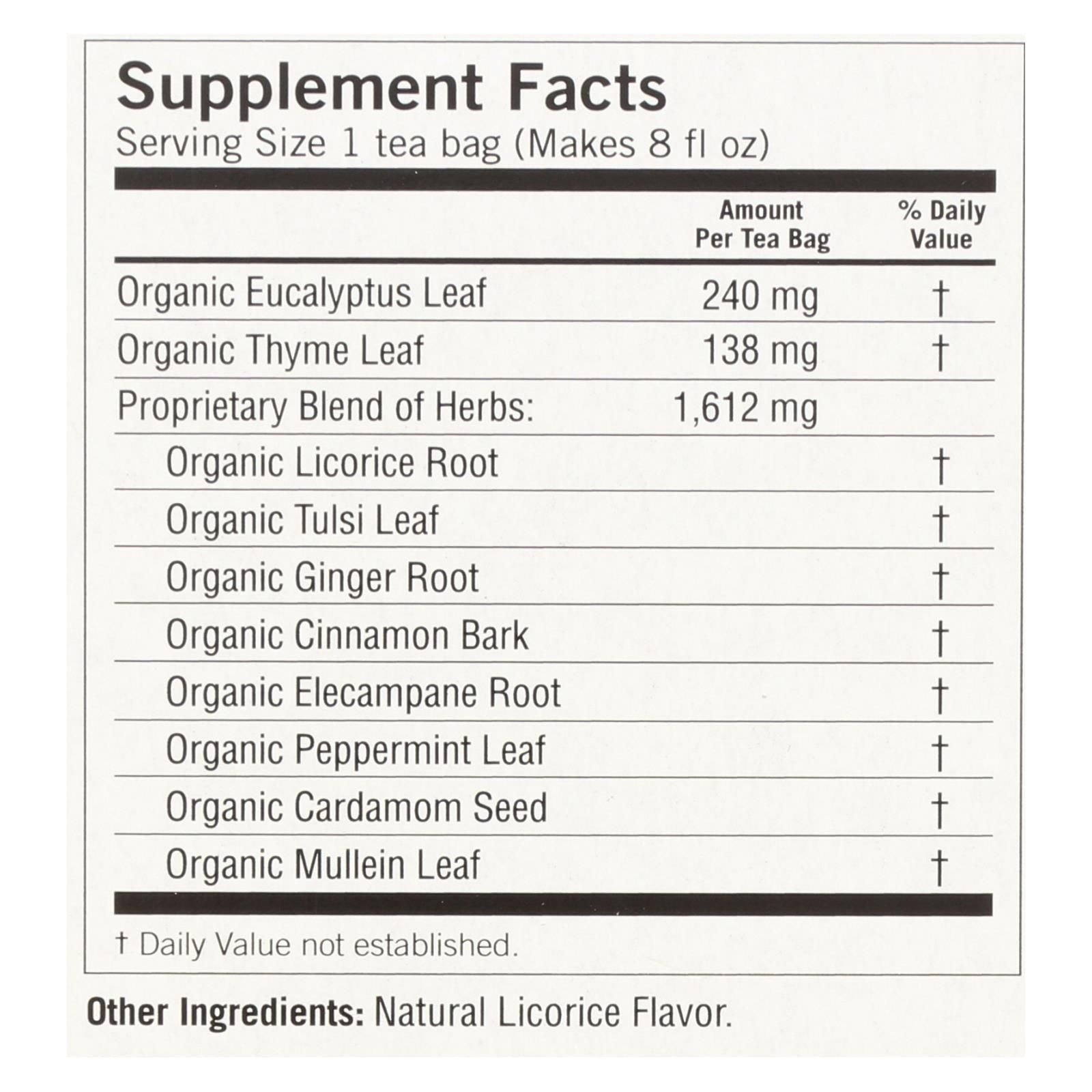 Yogi breathe deep, spicy-sweet herbal supplement is a delicious tea blend that has no irradiated ingredients. This herbal supplement tea is kosher, non-gmo, organic, vegan and free of caffeine. Breathe deep of the enchanting aromas of licorice and thyme, eucalyptus and spices. Each box contains 16 tea bags.